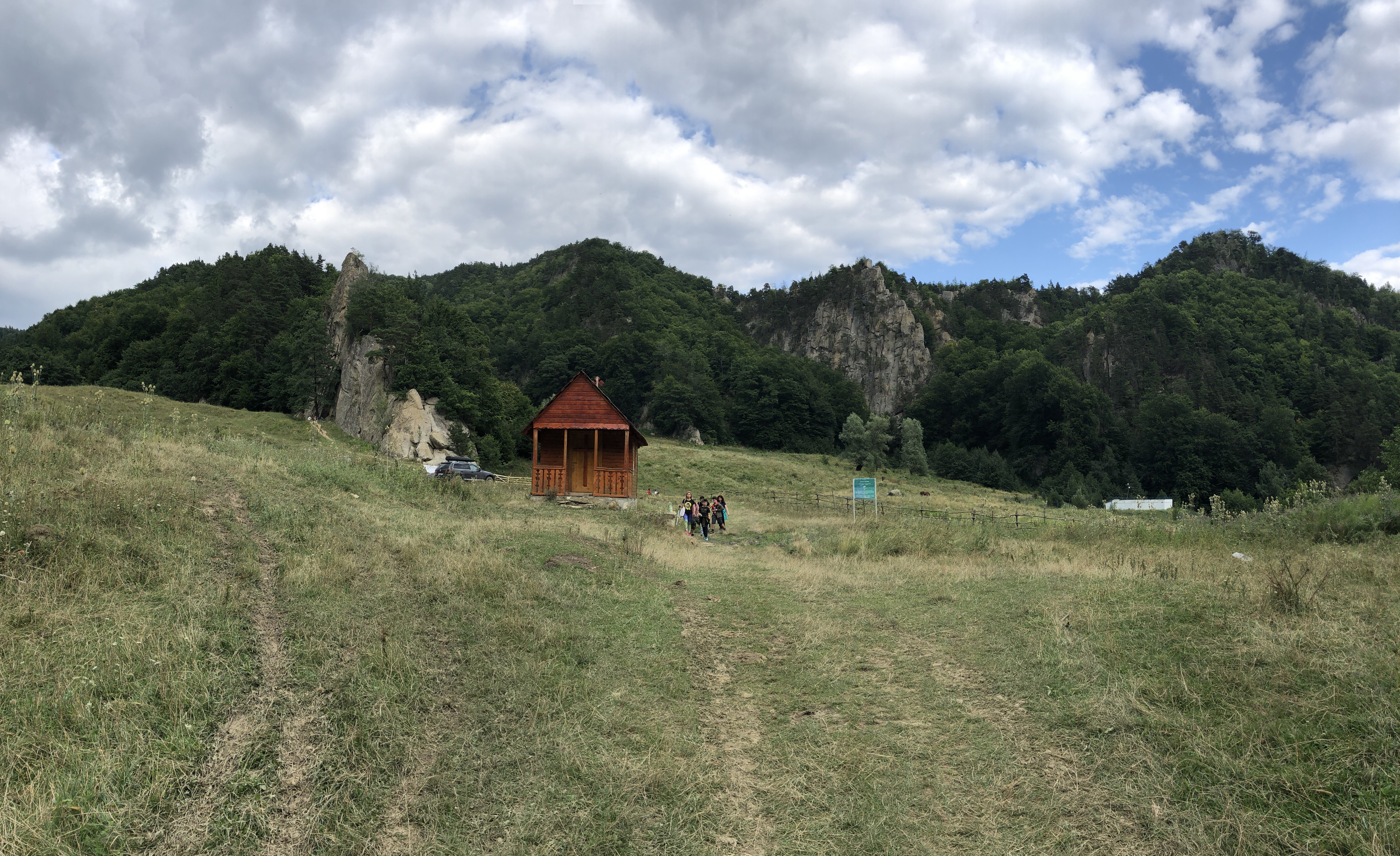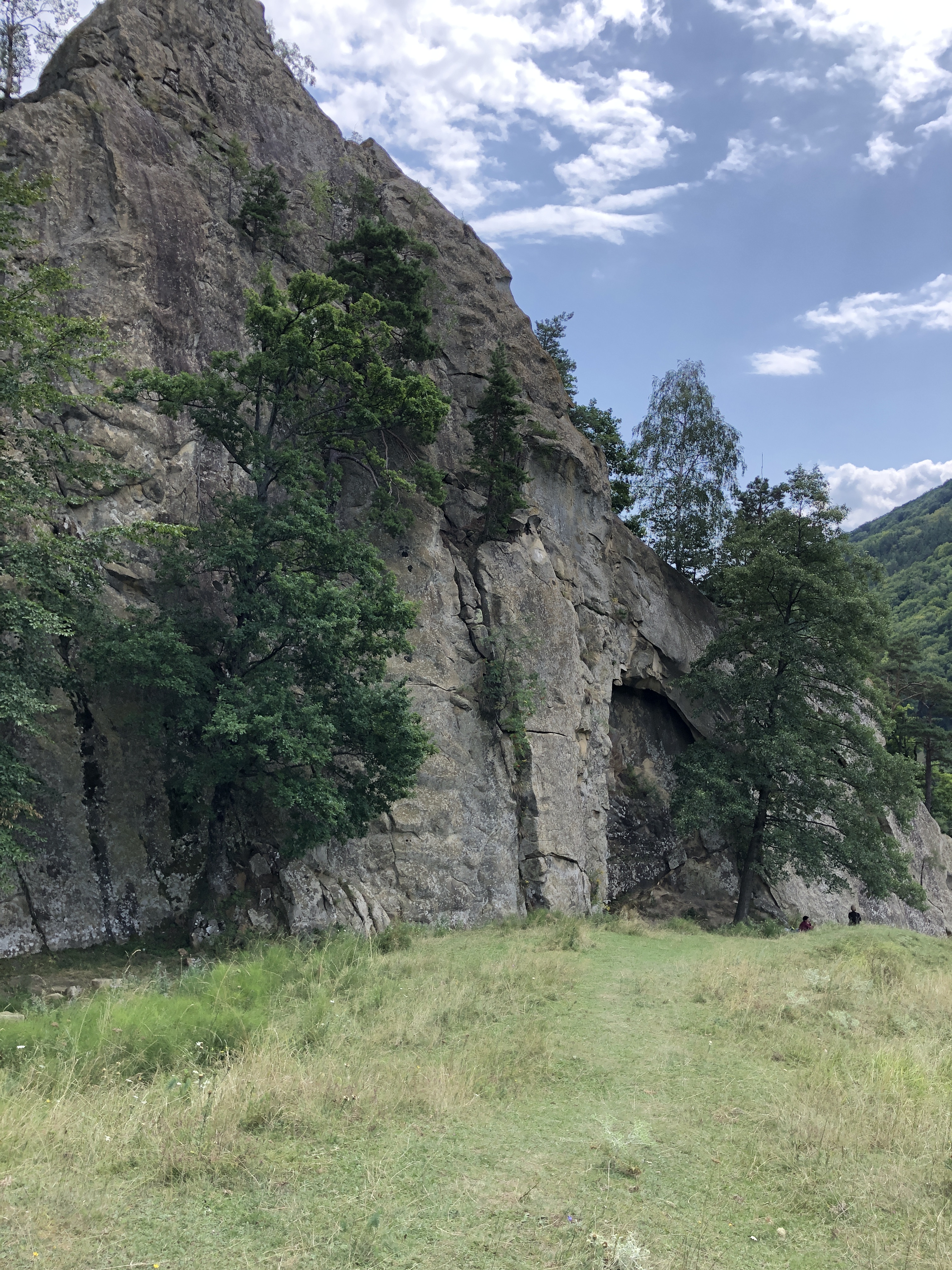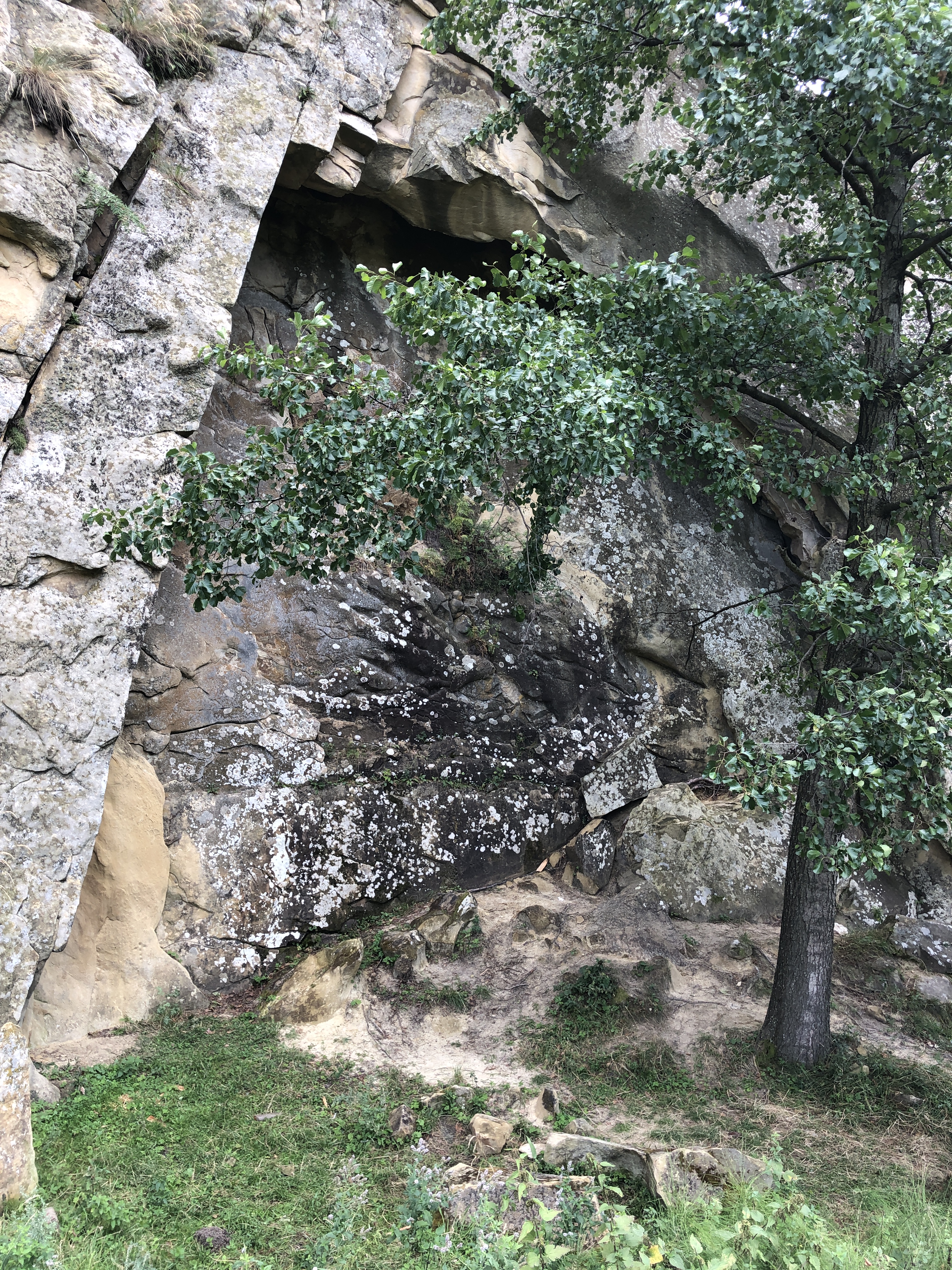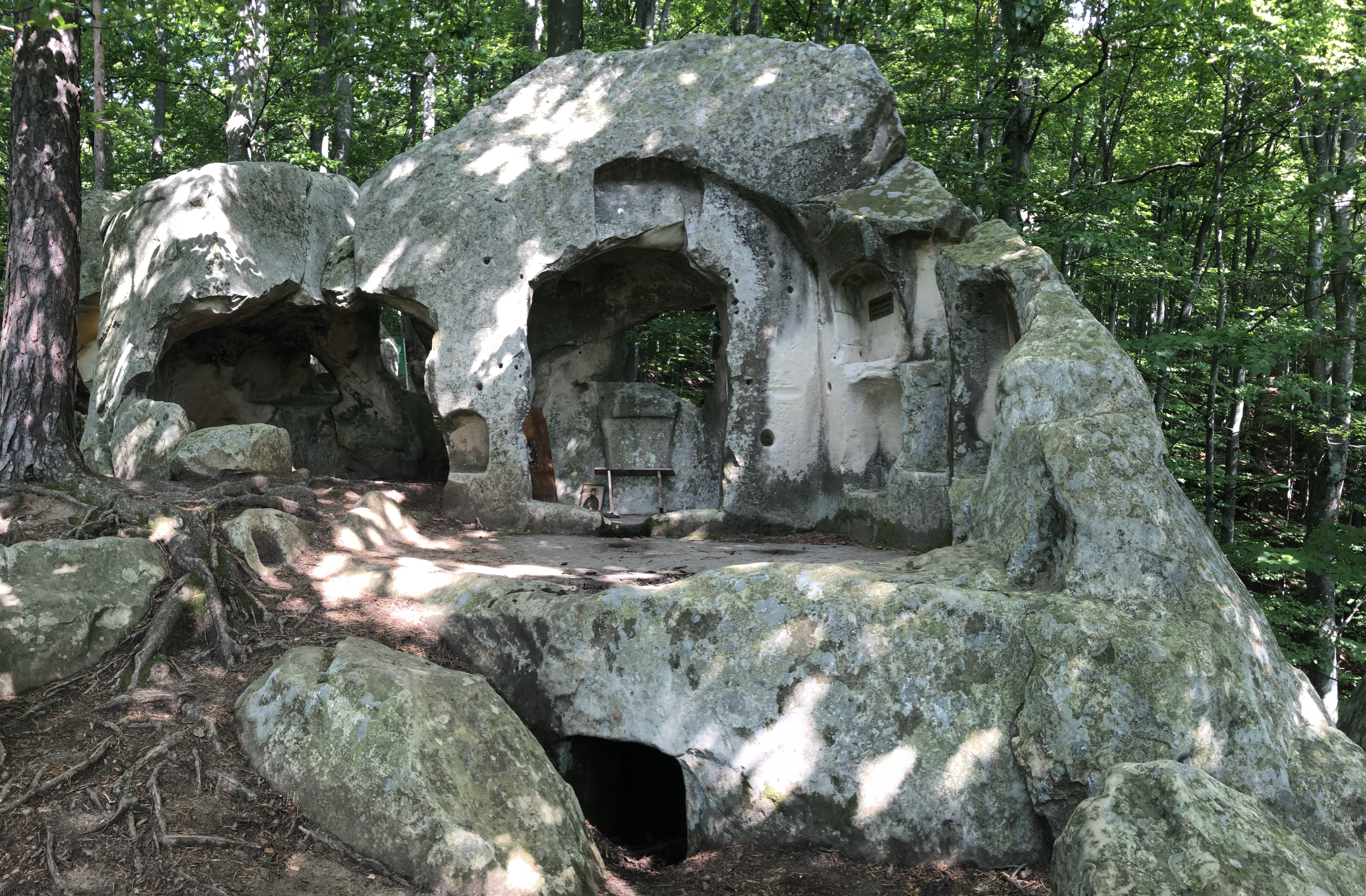 We took our trekking sticks and started walking again on that forest road, between some old abandoned homes. The road ends with a very old willow – it took 3 persons to hug it, we hugged it all. After climbing some improvised stairs through shrubs and spiders on a 15 inches path with weird footprints, we saw it!