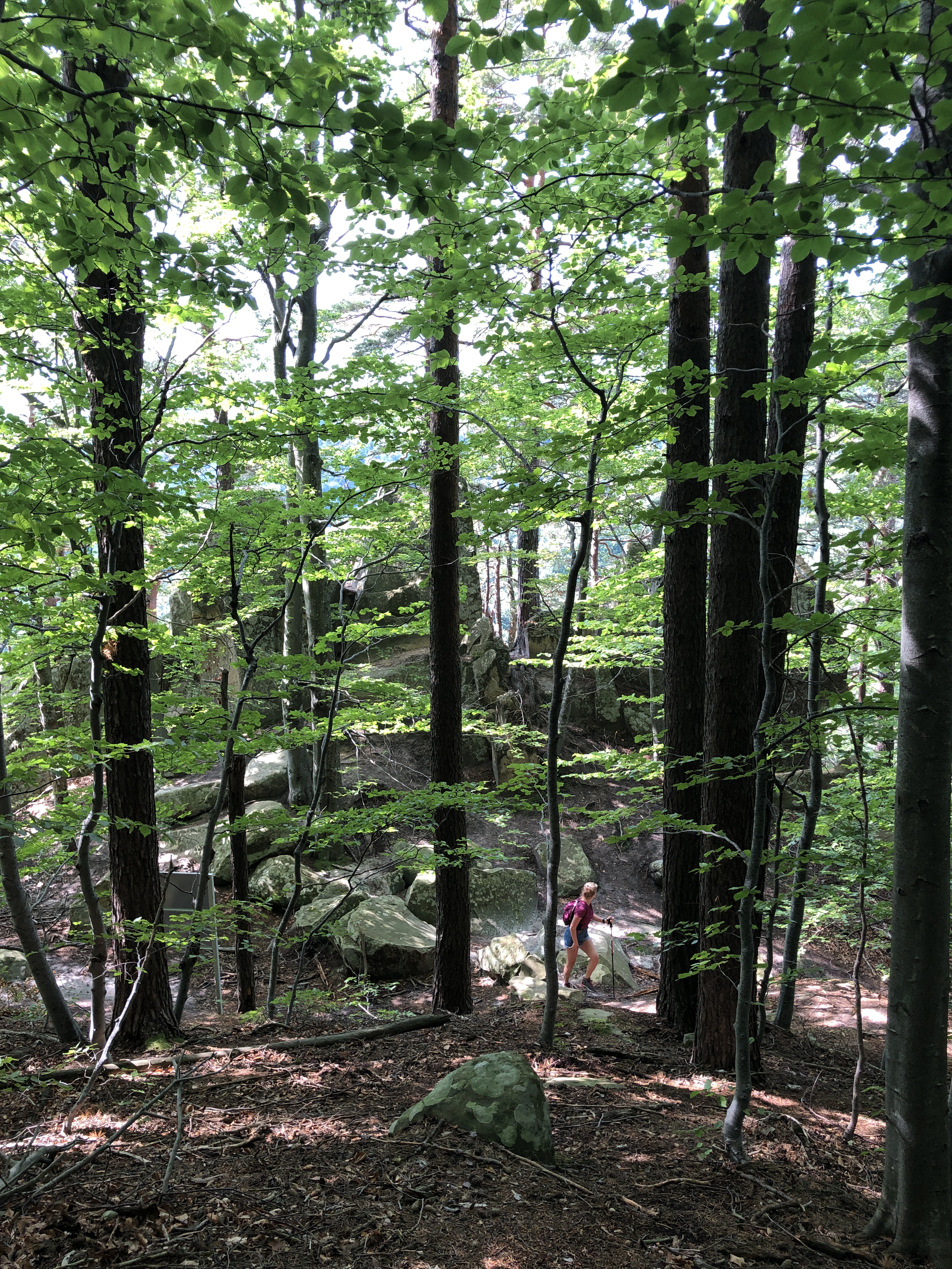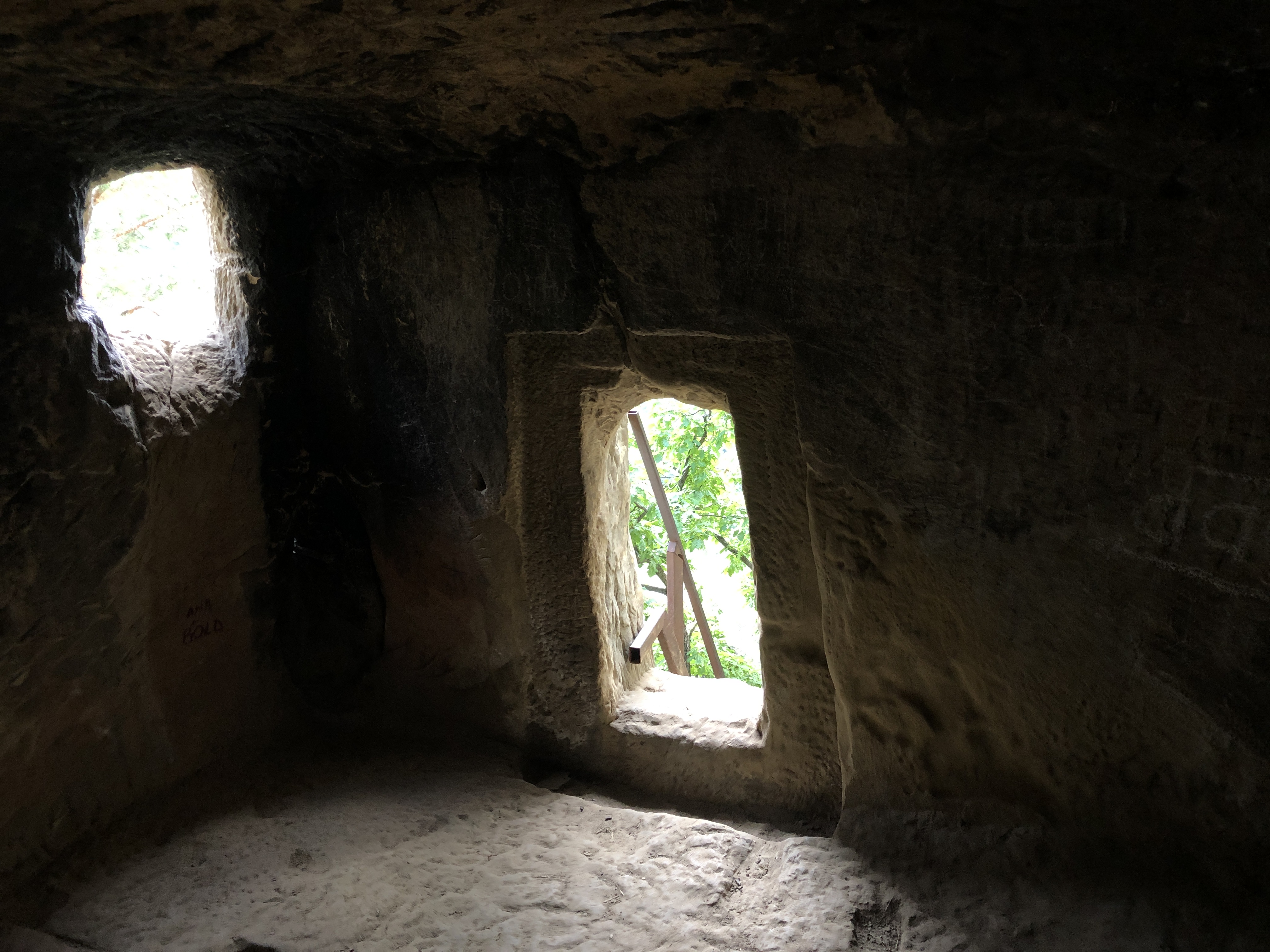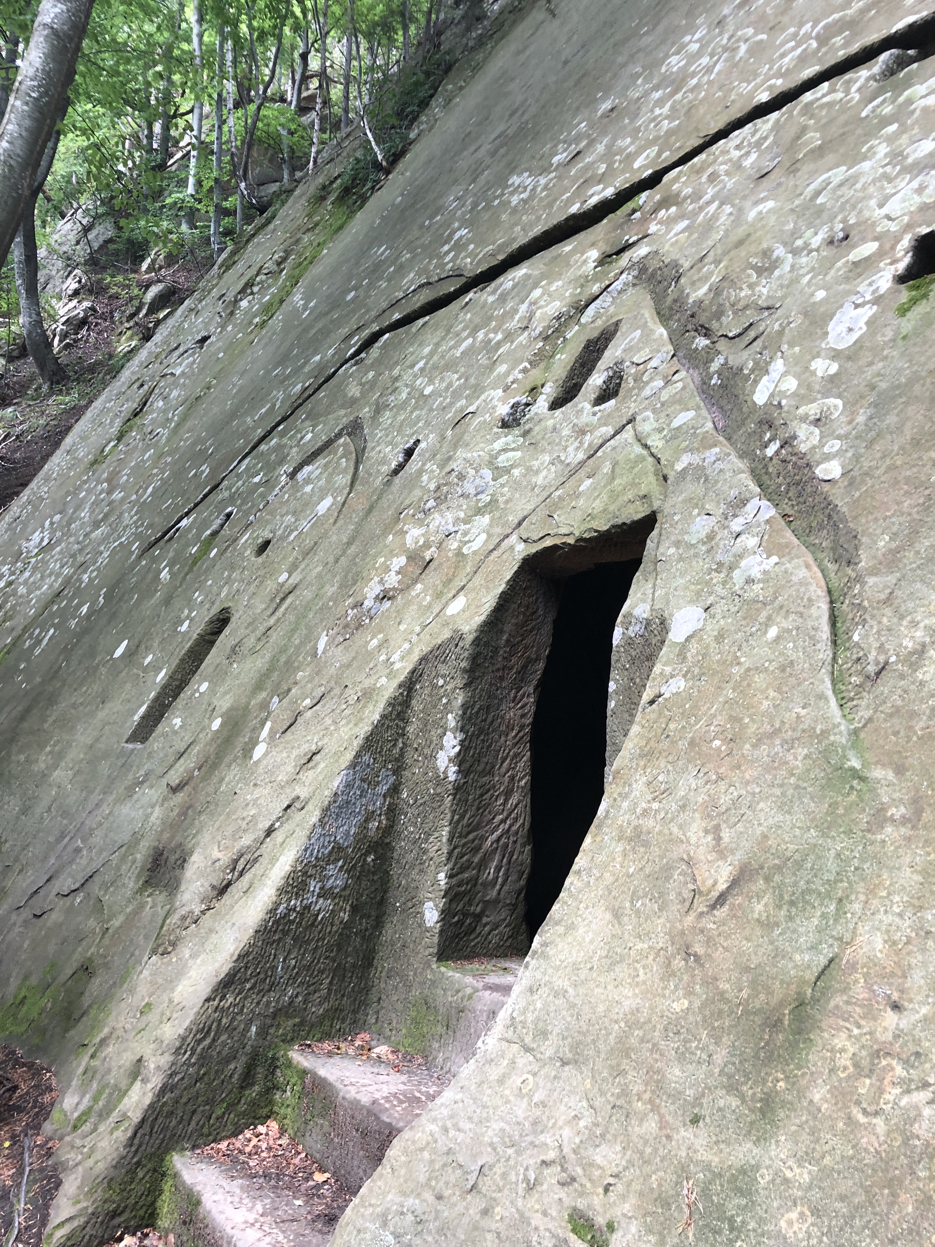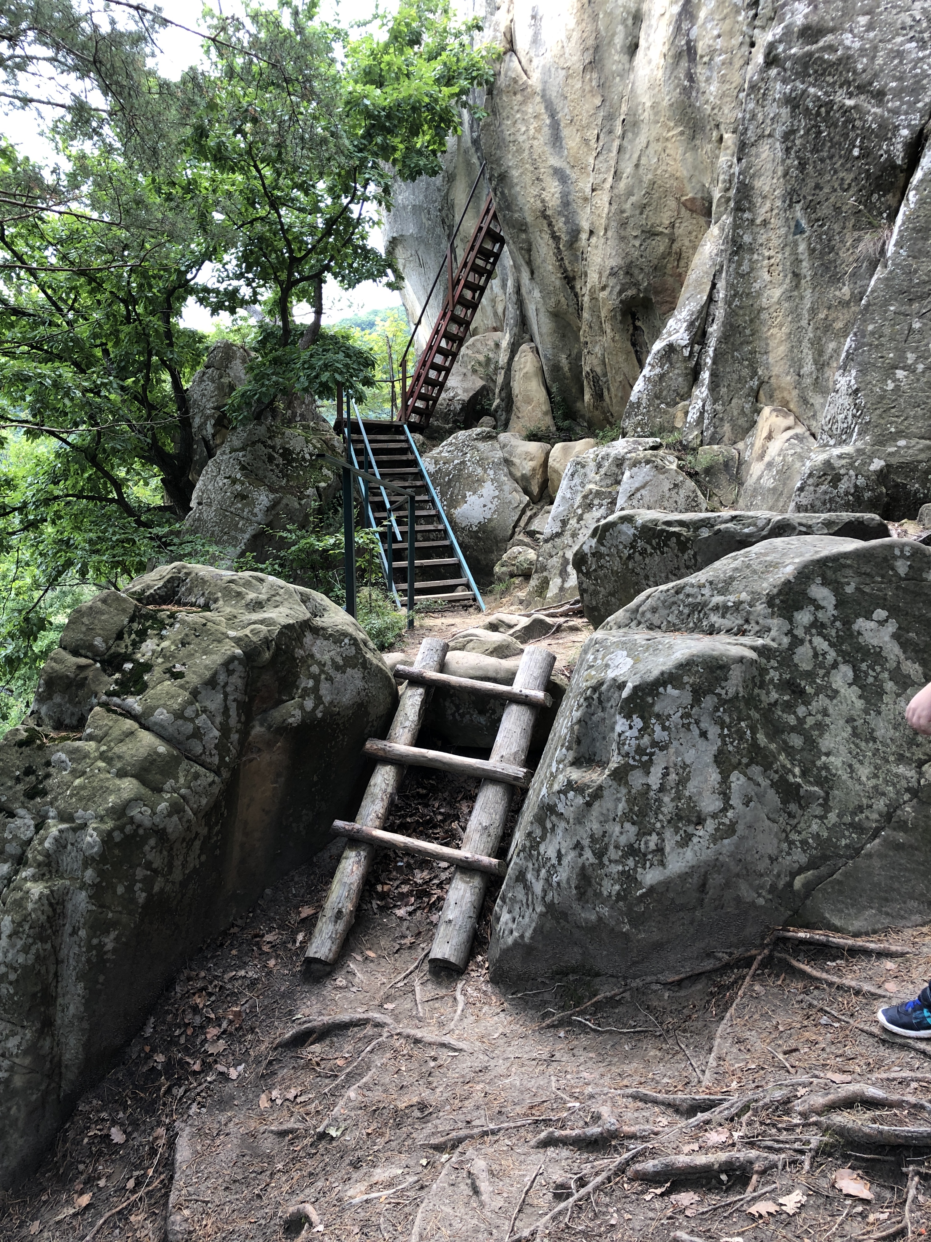 We took our trekking sticks and started walking again on that forest road, between some old abandoned homes. The road ends with a very old willow – it took 3 persons to hug it, we hugged it all. After climbing some improvised stairs through shrubs and spiders on a 15 inches path with weird footprints, we saw it!