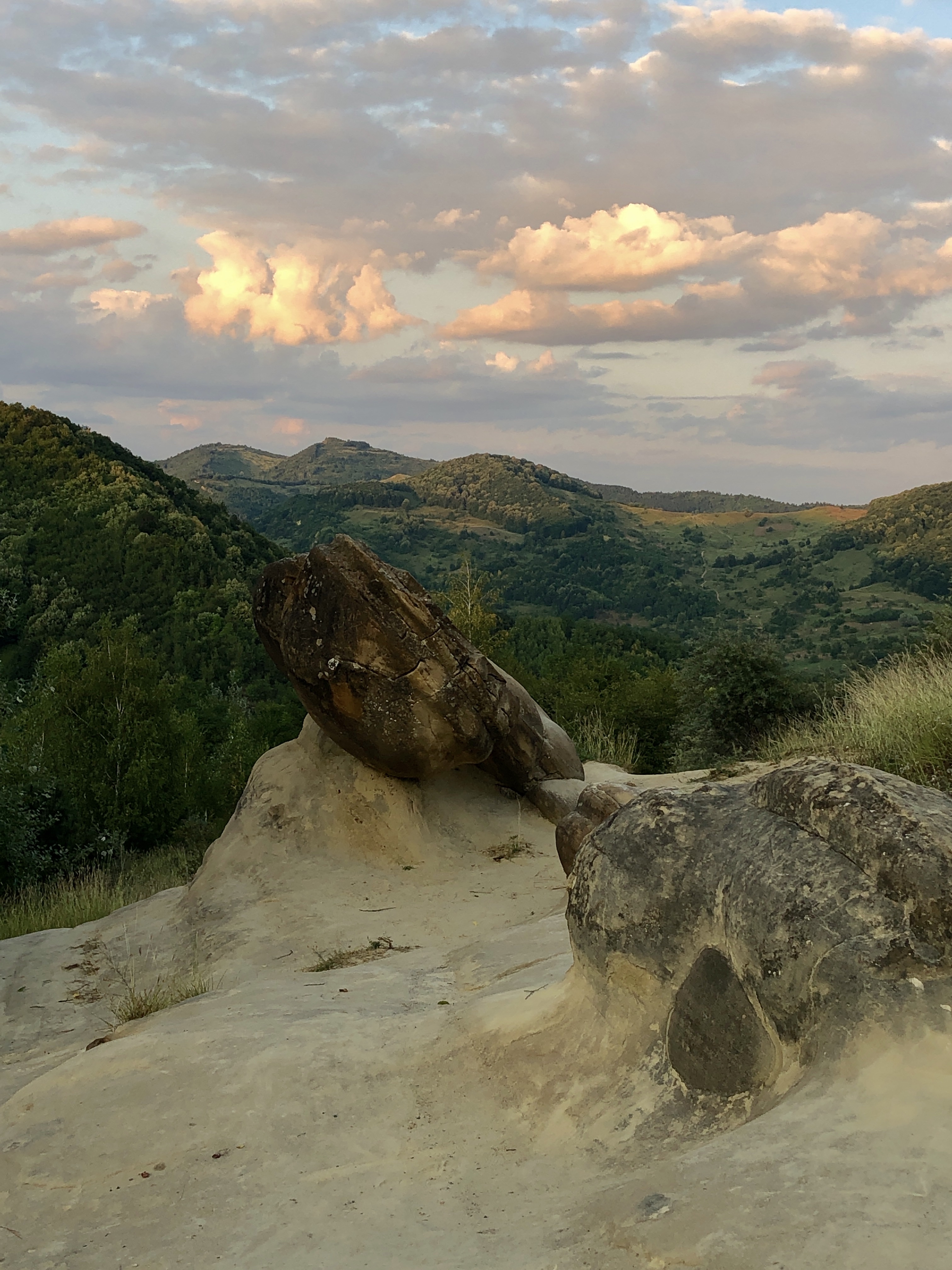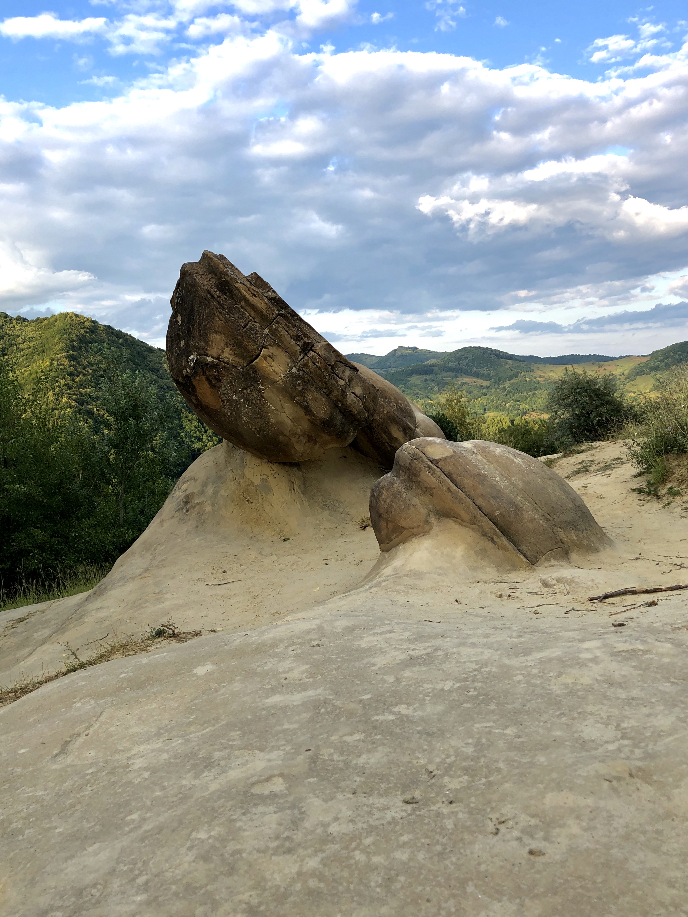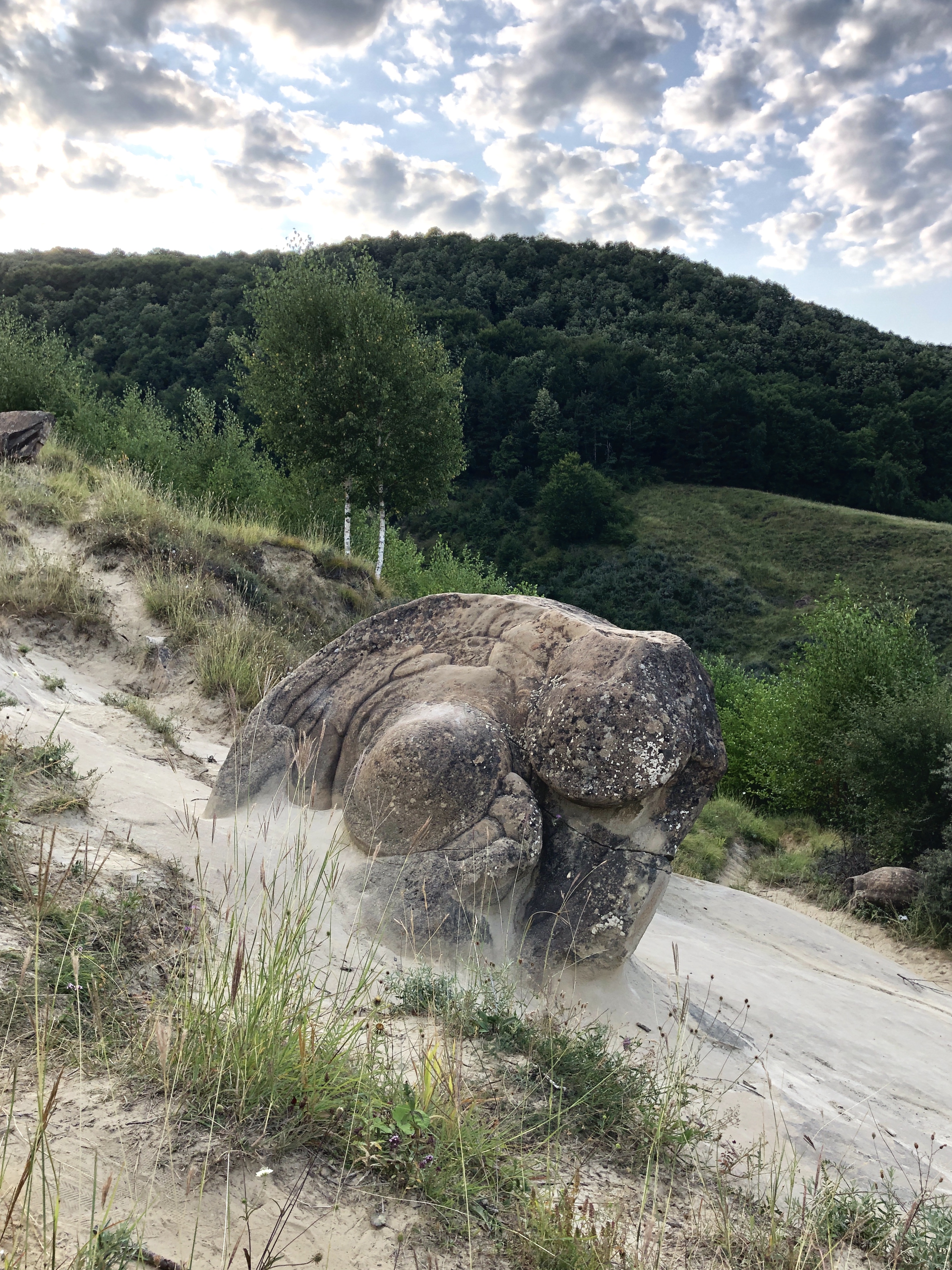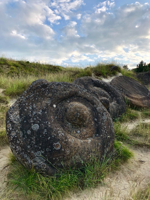 So here we are, on top of the cliff, where the august sun was smiling again, the sand was so fine that any gust of wind swept it away. Clusters of perfectly round rocks, built in slices or onion leaves covered partially in sand. I felt like Olaf, I was running towards them and hugged them, they were cold as ice, but irradiated some sort of warm and cozy energy. I stood in front of one of them for a couple of minutes waiting for it to respond somehow, it felt like I was in The Valley of living Rocks (from Disney’s movie, Frozen). We moved on, on a sandy path between “the trolls” (Frozen), and arrived in a meadow were some weird structures appeared, some of them looked like columns, others like giants. It felt like those were pre-human attempts or Luana’s unborn clay golems that fossilized. My wife had another opinion, she thought that might’ve been a very old underwater civilization, like Atlantida, due to the fine motifs. I felt in love with that place, we stood there and watched the sunset, with our new friends.